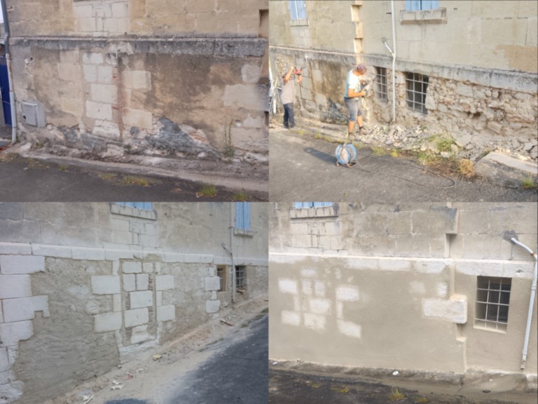 - Une première tranche de ravalement de façade a été menée à bien : le mur extérieur le long de la rue des Écus (à droite du portail) a été rénové et enduit à la chaux. Nous avons l'intention de poursuivre avec d'autres pans de murs (à l'extérieur et dans la cour).