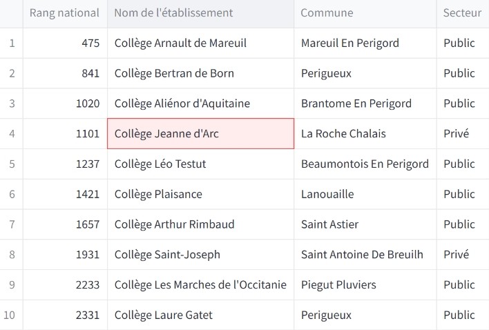 En 2025, le collège Jeanne d'Arc de la Roche-Chalais apparait comme le meilleur collège privé sous contrat de Dordogne et le 4e meilleur collège du département sur 45 établissements tous secteurs confondus (public et privé).